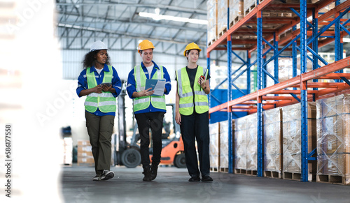 Distribution warehouse manager using tablet to check stock on storage shelf. Multiethnic woman worker and colleague working together at storehouse discussing inventory as order. Diversity of people