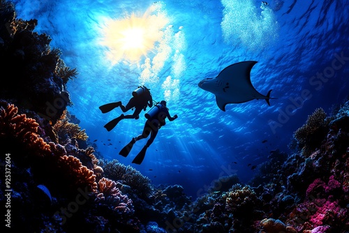 Divers explore vibrant coral reef with a majestic manta ray swimming by in clear blue waters, capturing the beauty of the underwater world.