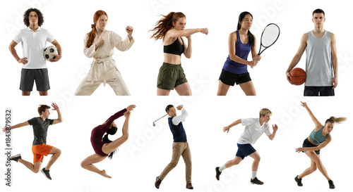 Diverse athletes showcasing various sports and disciplines in dynamic poses against a plain