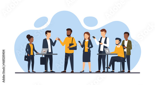 Diverse business professionals collaborating and communicating in a modern office environment. Ideal for showcasing teamwork, digital connectivity, and corporate culture.