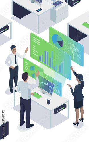 Diverse business team analyzing financial data charts and graphs on futuristic holographic displays in modern office collaboration concept for corporate presentations technology and analytics