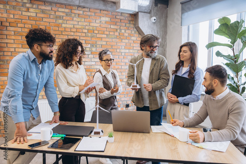 Diverse business team collaborating in an office meeting, discussing renewable energy and presenting wind power projects