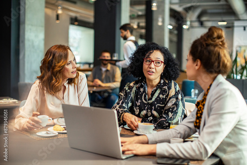 Diverse businesswomen having meeting in hotel restaurant