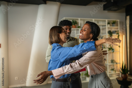 Diverse colleagues greeting and hugging in modern office