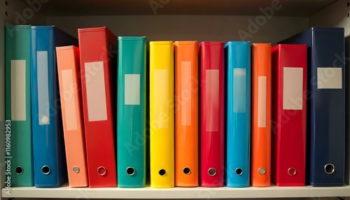 Diverse collection of colorful binders on a shelf, each in a different size and hue