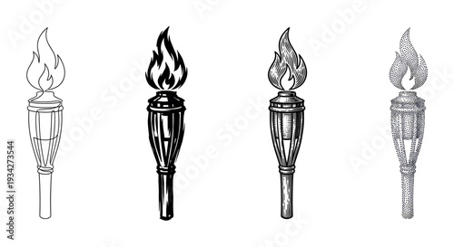 Diverse collection of flaming torches presented in distinct artistic styles such as line art, solid, engraved, and stippled.