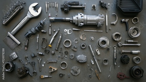 Diverse Collection of Tools and Spare Parts Arranged on a Workshop Table