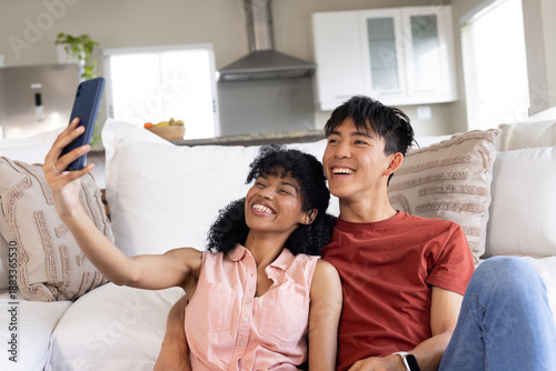 Diverse couple sitting on white sofa in open-plan home, woman holding smartphone, smiling