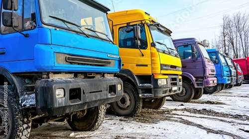 Diverse fleet of commercial trucks parked in winter conditions