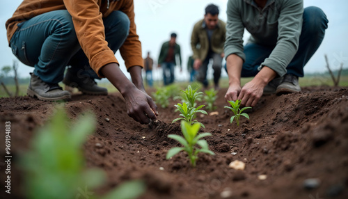 Diverse group of farmers planting seedlings in fertile soil, embodying sustainability and teamwork in rural agriculture. Ideal for eco-friendly campaigns.