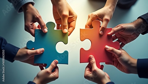 Diverse group of hands carefully connecting colorful puzzle pieces symbolizing collaboration teamwork and shared goals in a bright and hopeful setting