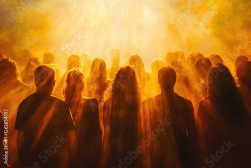 diverse group of people illuminated by ethereal golden light streams, spiritual gathering, mystical atmosphere, contemporary sacred art