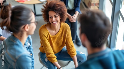 Diverse group of people in casual clothing having a discussion in a bright, modern office environment.