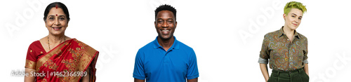 Diverse Group of Three Individuals: South Asian Woman in Traditional Attire, African American Man Smiling in Casual Blue Shirt, and Gender Non-Conforming Individual with Green Hair in Stylish Outfit