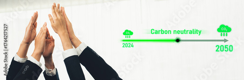 Diverse hands unite in a symbol of collaboration aimed at achieving carbon neutrality by 2050, representing hope and commitment to a sustainable future. Trope