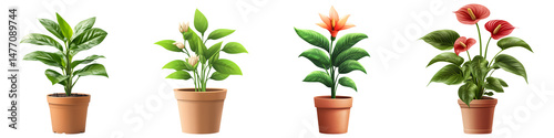 Diverse potted plants exhibit unique floral arrangements, enhancing botanical variety on transparent background