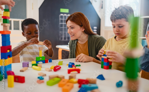 Diverse preschool children play with colorful building blocks at a classroom table, guided by a smiling teacher in a creative, inclusive early learning environment.