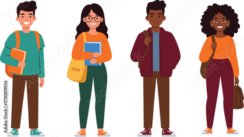 Diverse students, school supplies, backpacks, books, education illustration, academic lifestyle, youth group, learning concept, modern outfit, clean background, cartoon style
