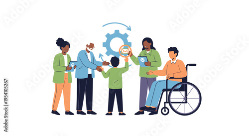 Diverse Team Collaboration on Digital Workflow. Multigenerational Group with Disability Engaged in Communication Process.