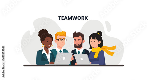 Diverse team of professionals collaborating effectively on laptops, showcasing unity and shared goals in a modern workspace.