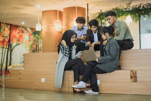 Diverse work team talking brainstorming on project strategy, smiling multiethnic employees discuss share ideas using laptop at creative office space. Collaboration concept.