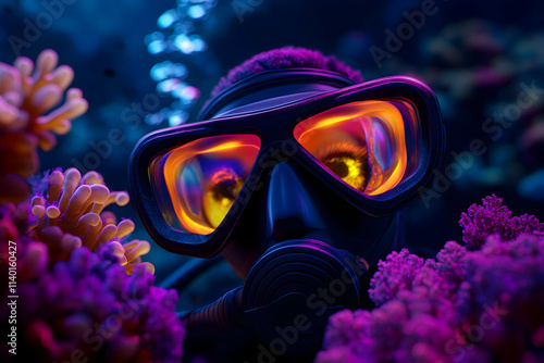 Diving mask illuminates colorful coral reef in immersive underwater scene, creating a captivating view of marine life