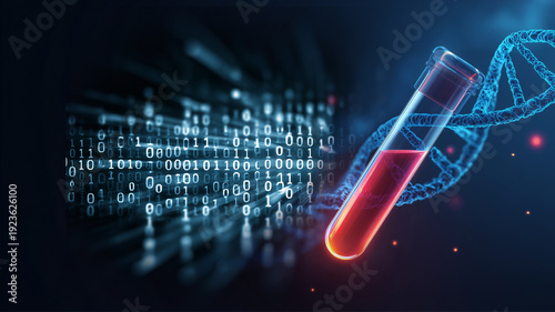 バイナリコードとDNAらせんのデータ解析イメージ|ゲノム×AI医療テクノロジー(デジタル解析寄り)