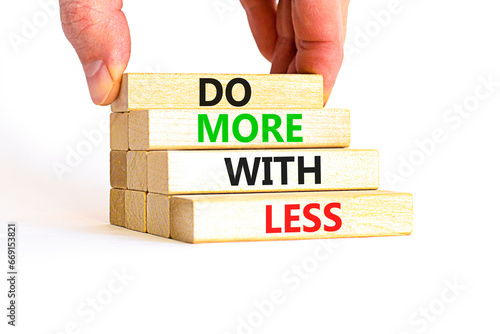Do more with less symbol. Concept word Do more with less on beautiful wooden block. Beautiful white table white background. Businessman hand. Business do more with less concept. Copy space.