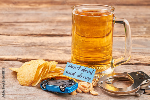 Do not drink and drive concept. Beer, handcuffs, chips, turned over car, wooden background.