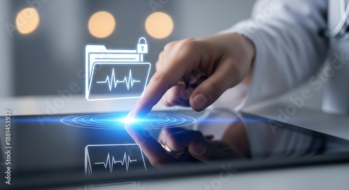 Doctor accessing secure electronic health records (EHR) on a digital tablet screen interface.