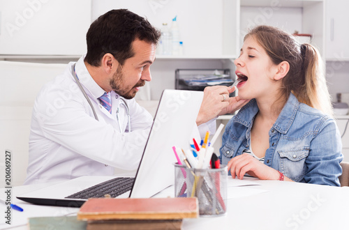 Doctor and girl with sore throat
