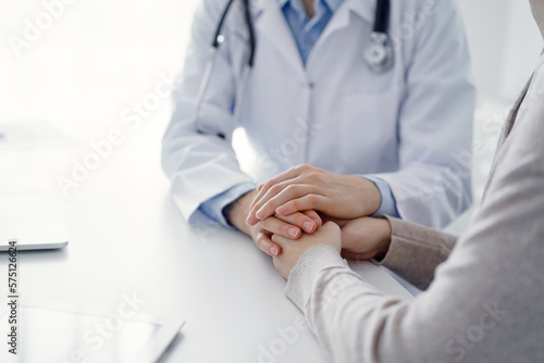 Doctor and patient sitting at the table in clinic office. The focus is on female physician's hands reassuring woman, only hands close up. Medicine concept