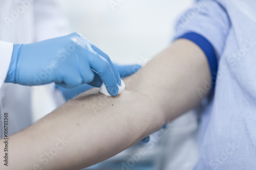Doctor cleaning patient's arm with cotton pad before injection