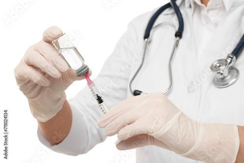 Doctor filling syringe with medication from glass vial on white background, closeup