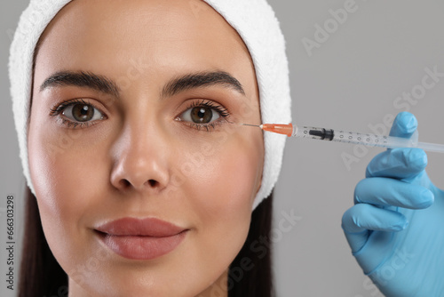 Doctor giving facial injection to young woman on light grey background, closeup. Cosmetic surgery