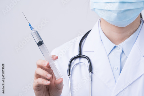 Doctor holding syringe with face mask, concept of young female physician injects coronavirus, COVID-19 vaccine on white background, close up, copy space