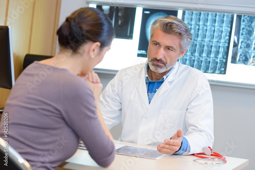 Doctor in consultation with woman, grave expression