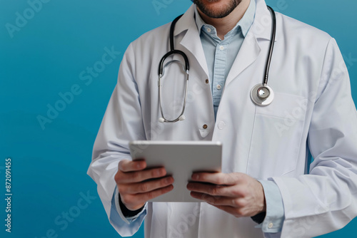 Doctor in white coat holding digital tablet, smiling, healthcare technology on blue backdrop