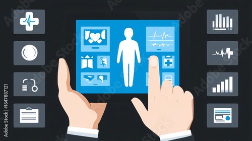 Doctor in white coat holding tablet with schematic futuristic human body illustration. Concept of advanced medical technology, digital clinical diagnostics, AI in healthcare, and future innovations.