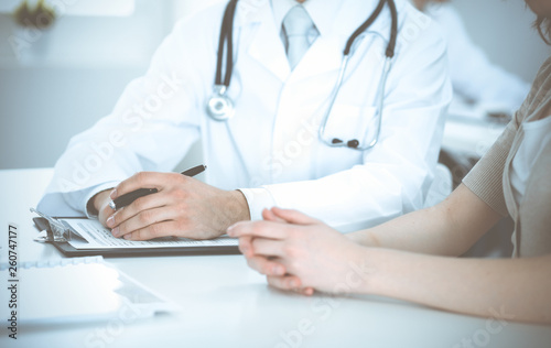 Doctor man and patient are discussing something, just hands at the table. Medicine and health care concepts