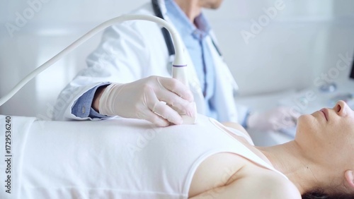 Doctor man using ultrasound equipment on the breast of a female patient. Female breast cancer prevention. mammary gland health. Medicine concept