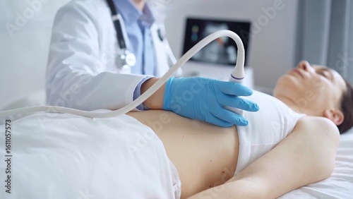 Doctor man, wearing blue medical gloves, is using ultrasound equipment on the breast of a female patient lying down for a medical cardiology examination. Medicine concept