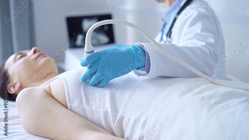 Doctor man, wearing white medical gloves, is using ultrasound equipment on the breast of a female patient. Female breast cancer prevention. Medicine concept