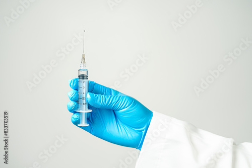 doctor or scientist holding a syringe in blue gloves