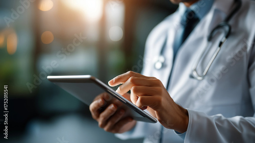 Doctor using tablet to provide recommendations and medication instructions UI sharp patient torso visible faces defocused care guidance faceless background defocused e