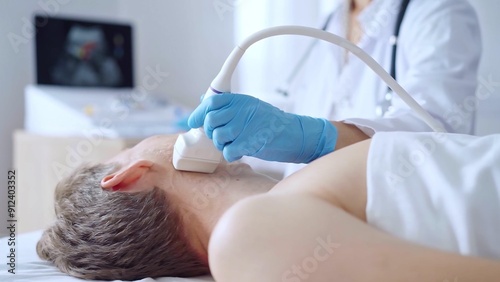 Doctor woman with a blue medic gloves performing neck ultrasound exam on male patient. Medicine service concept. Thyroid gland health
