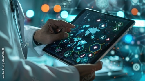 Doctor working on tablet with virtual screen medical icon on hospital background. Generate AI
