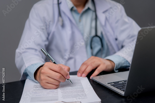 Doctor writing on documents, using laptop. Completing medical records, focused on accuracy. Professional healthcare practice, clinic environment. Medical documentation process.