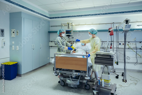 Doctors caring for patient in emergency care unit of a hospital taking blood sample