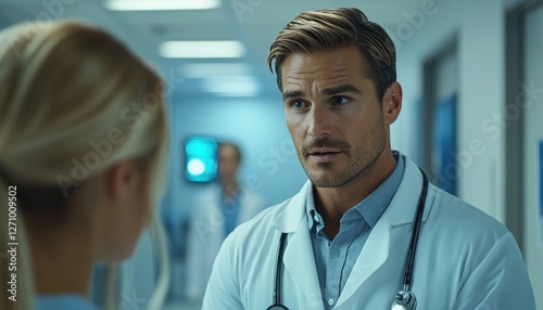 Doctors hallway conversation hospital healthcare teamwork